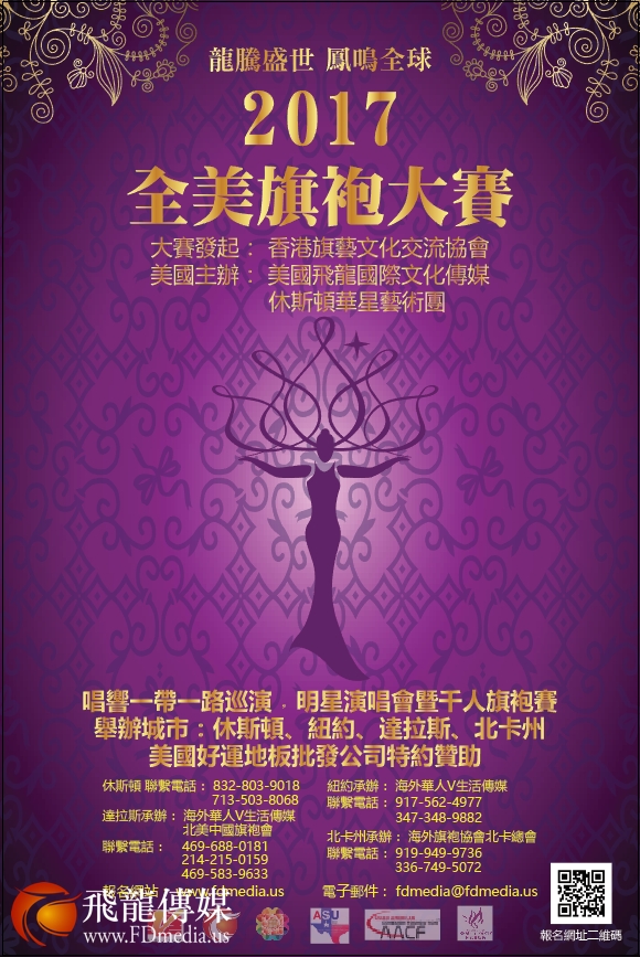 由香港旗艺文化交流协会发起,美国飞龙国际文化传媒集团和休斯顿华星艺术团同主办,美国好运地板批发公司特约赞助的“龙腾盛世、凤鸣全球”明星演唱会暨千人旗袍秀,唱响一带一路国际巡演 《2017美国旗袍大赛》得到中国国务院侨办的大力支持!