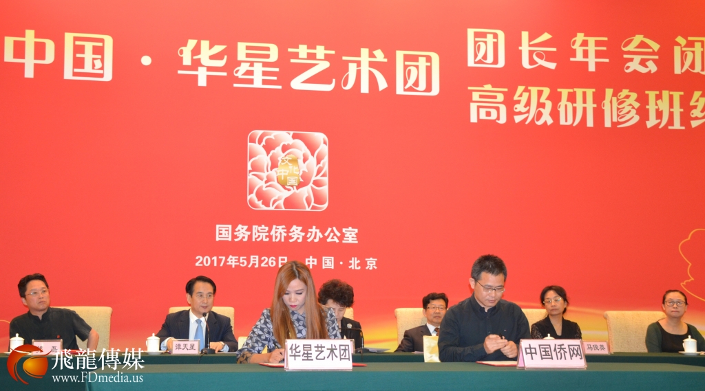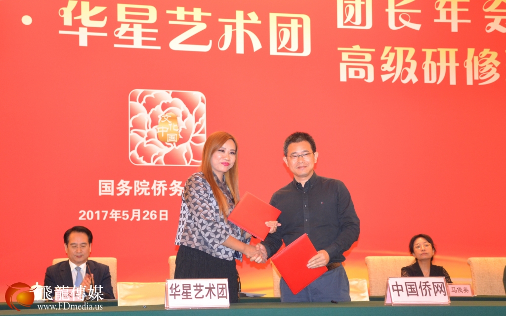 美国飞龙国际文化传媒集团负责人、休斯顿华星艺术团新闻总监 陈铁梅女士(图前左一),在中国国务院侨办主任裘援平、副主任谭天星、侨办宣传司司长许玉明等领导的见证下,代表全世界42家华星艺术团与中国侨网负责人签合作备忘录。