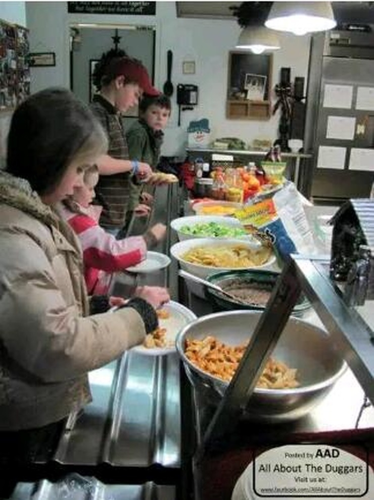 分工合作—做饭,每次用餐时,每名小孩就要排队,以自助餐的形式供应。这个家庭的另一个厨房原先是个废弃的车库,他们利用了4年时间将其改建成了一个独立的房屋。