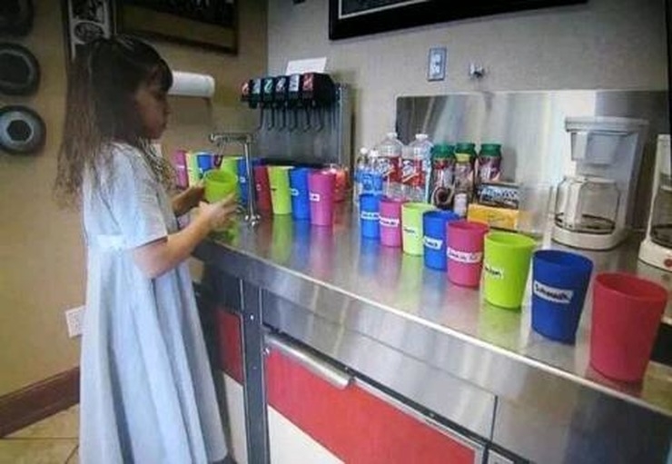 孩子们的饮料杯借助颜色加名字区分,所有孩子的名字均以“J”开头。