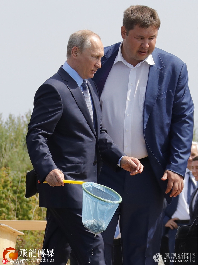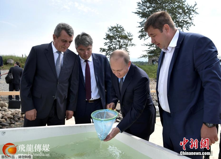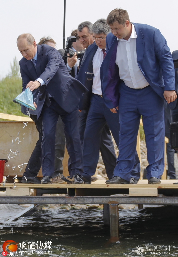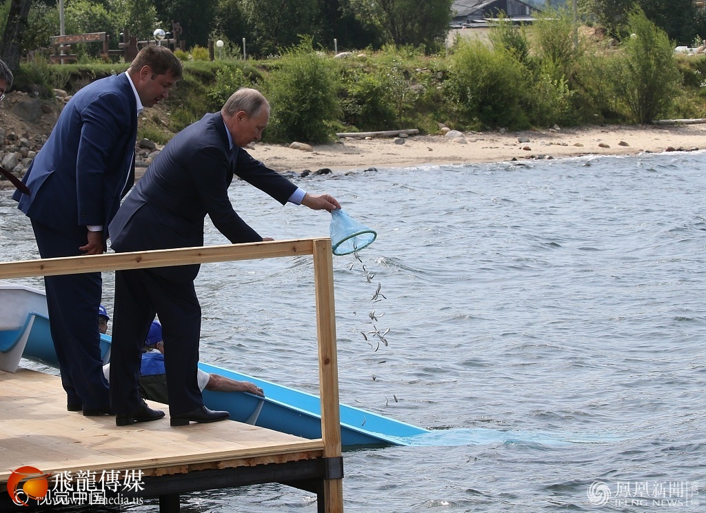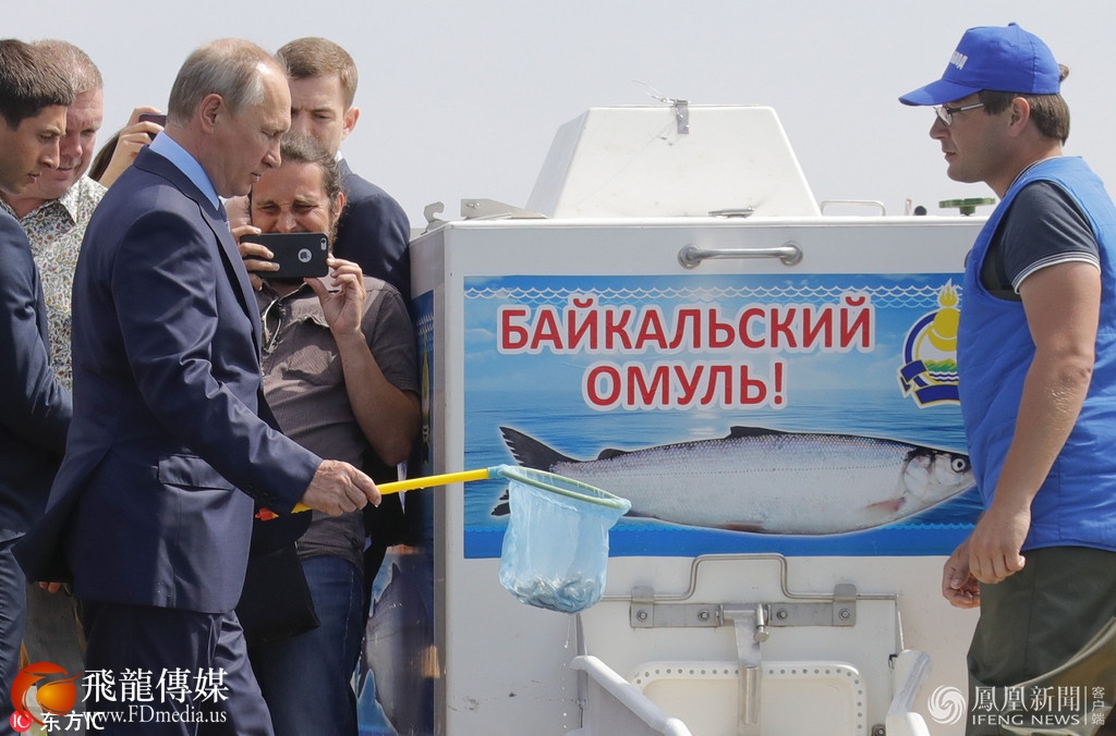 当地时间2017年8月4日,俄罗斯布里亚特共和国,俄总统普京走访当地,就布里亚特共和国和伊尔库茨克州森林火灾扑灭事宜进行指导,并现身贝加尔湖自然保护区,出席奥木尔鱼放生仪式。来源:东方IC