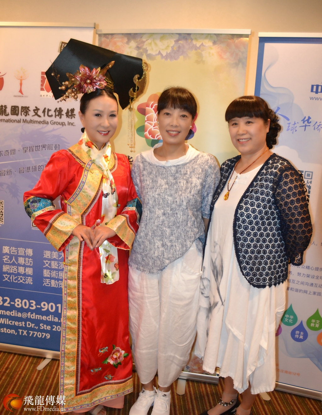 图左起:休斯敦幸福读书会会长 陈霞(Cindy)、何冰、飞龙传媒董事长、2017美国旗袍大赛总策划 陈铁梅合影。