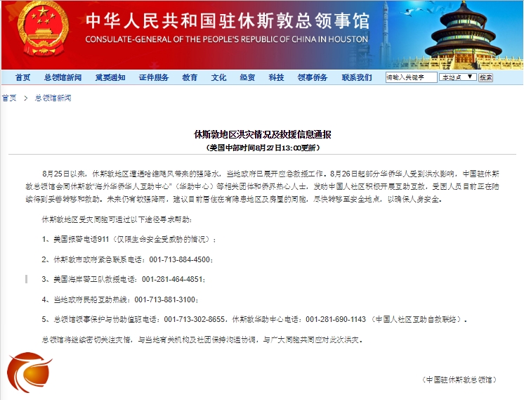 8月25日,休斯敦地区遭遇哈维飓风带来的强降水,中国驻休斯敦总领馆提醒华侨华人注意安全,并且及时联络休斯敦社团采取救援救助行动。总领馆提醒侨胞,未来仍有较强降雨,建议目前居住在有隐患地区及房屋的同胞,尽快转移至安全地点,以确保人身安全。