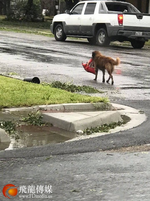 飓风哈维袭击德州,带来强降雨。8月26日,Tiele Dockens在她的脸书上发布了一张在德州辛顿(Sinton)街头拍下的小狗照片,照片中一只混种德国牧羊犬叼着整袋狗粮走在街上。照片在脸书上爆红,网民称赞这只牧羊犬充分展现了坚毅不拔的“德州精神”,对它“做好了万全准备”给予了高度肯定。