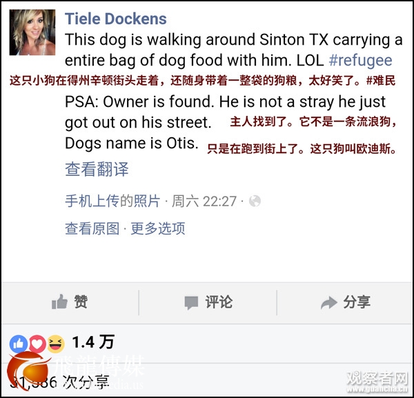 照片发布者达肯斯在配文中写道:“这只小狗在德州辛顿街头走着,还随身带着一整袋的狗粮,太好笑了。”文字末尾还加上了标签“难民”(refugee)。
