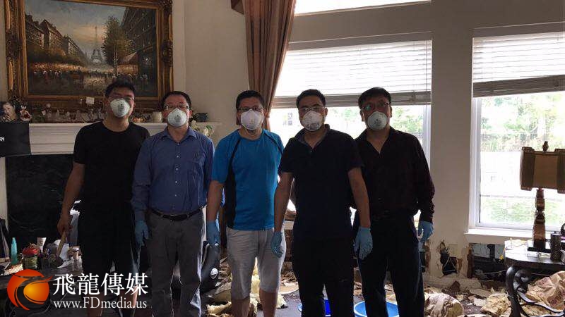 山东同乡会修宗明,杜英杰,苗巍,范崇海,李总以及赵连功等老乡组成的义工小组,正在为张磊会长清理被淹的家。
