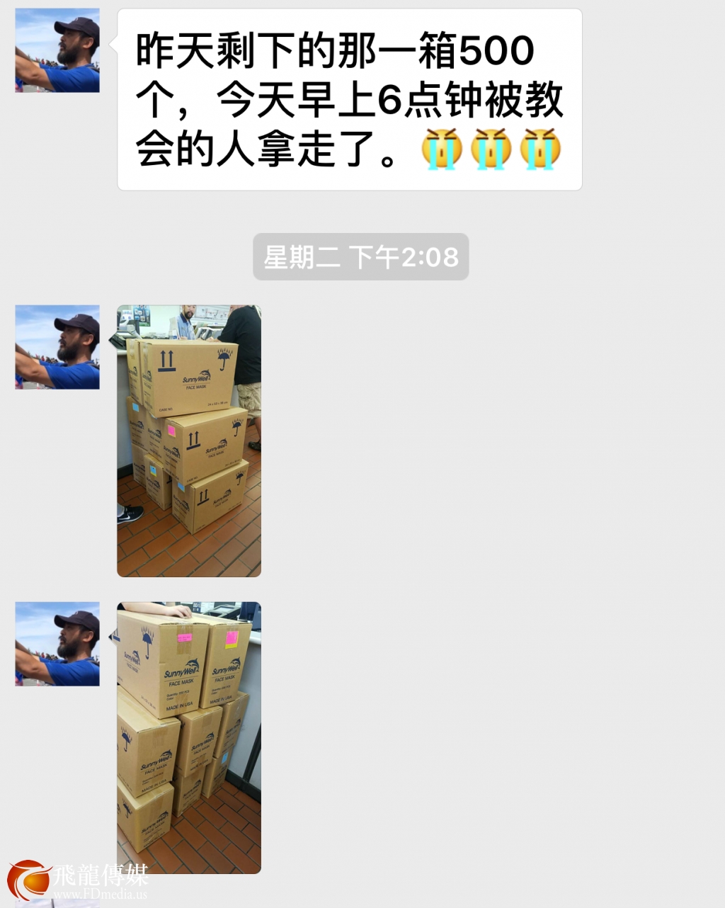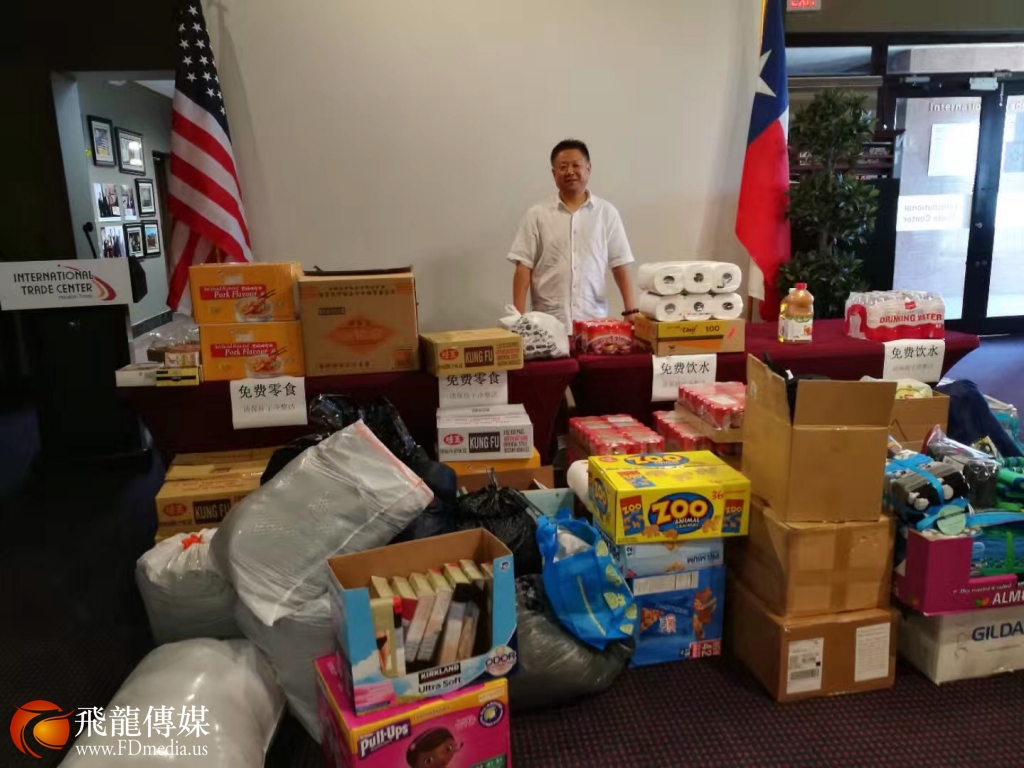 美南山东同乡会捐出的物资堆成了小山,会长房文清坚守现场派发救灾物资。