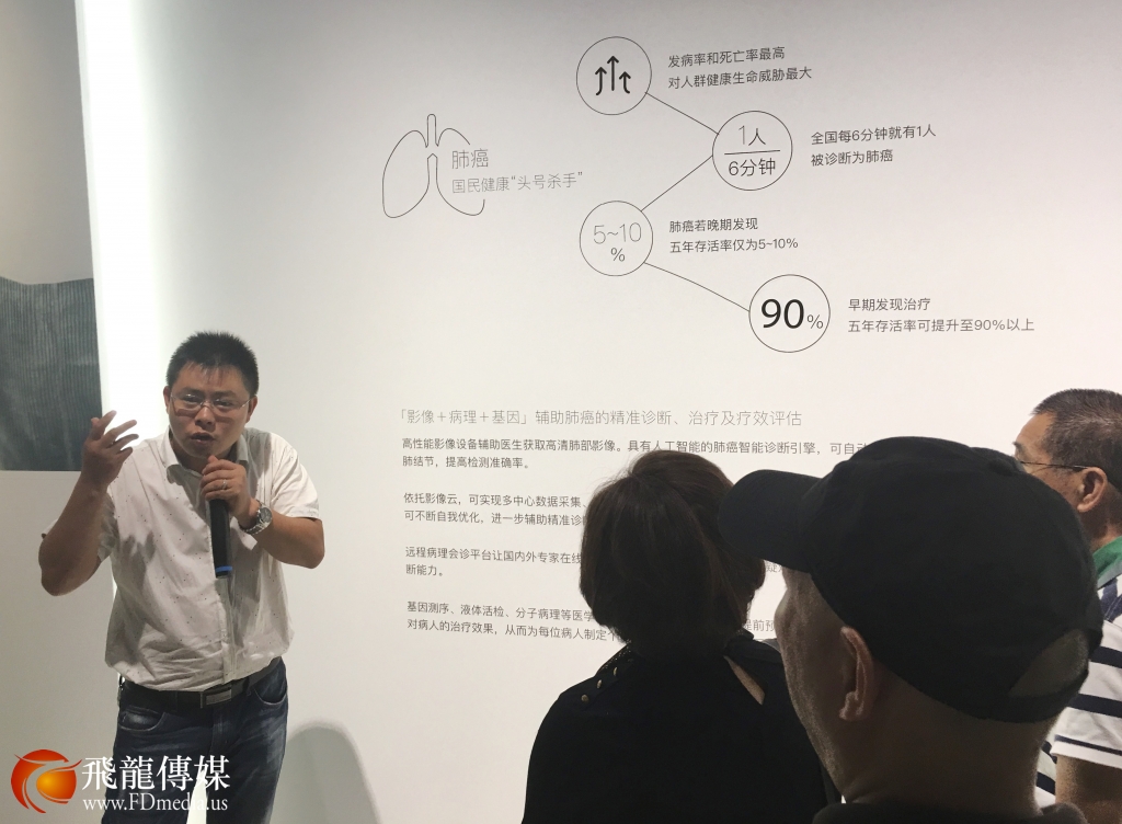 26家海外华文媒体负责人参观考察联影(贵州)医疗健康产业基地,了解大数据在医疗方面的运用,找出多种疾病的发生原因,提早治疗,提高国的健康。讲解员,联影(贵州)医疗健康产业负责人 专家赵灵先生