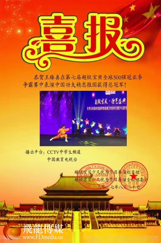 2017 CCTV 第七届超级宝贝全球500强冠亚季军争霸赛于8月12-13日在北京盛大举行。经过超级宝贝的平台通过海选、初赛、复赛的层层选拔,来自全球各地的数百名选手云集于北京亦庄经济技术开发区中国教育电视台演播中心。最后有62个节目晋级到全球500强冠亚季的争霸决赛。释行浩大师弟子功夫小丫王臻真作为2016年超级宝贝北美赛区幼儿组第一名应组委会的邀请参加了这一重要赛事。