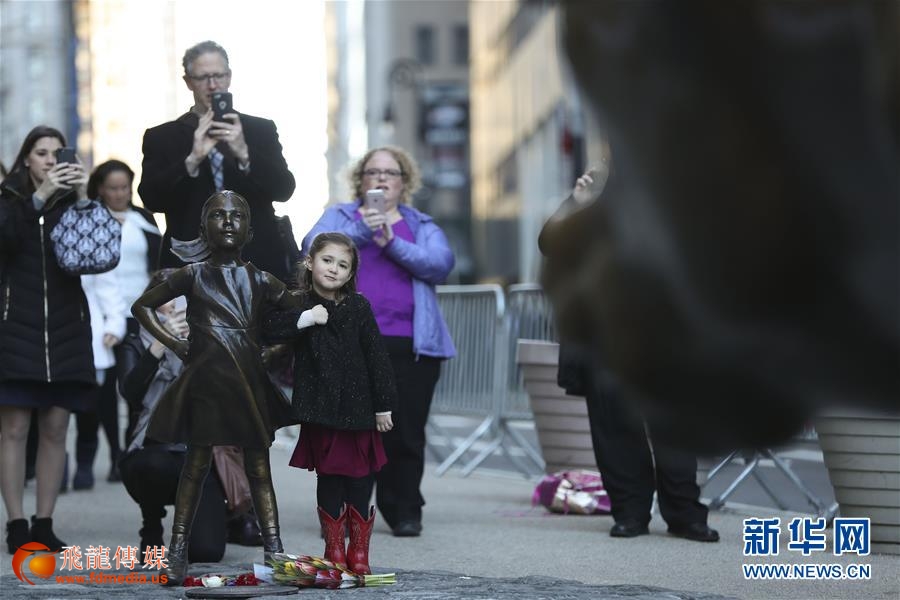 3月9日,一名女孩在美国纽约华尔街铜牛对面的“无畏女孩”塑像旁留影。 2017年国际妇女节之际,一座“无畏女孩”塑像悄然出现在纽约华尔街铜牛对面。据了解,这座塑像由一家金融投资公司放置于此,呼吁企业给予女性平等的工作和晋升机会。新华社记者王迎摄