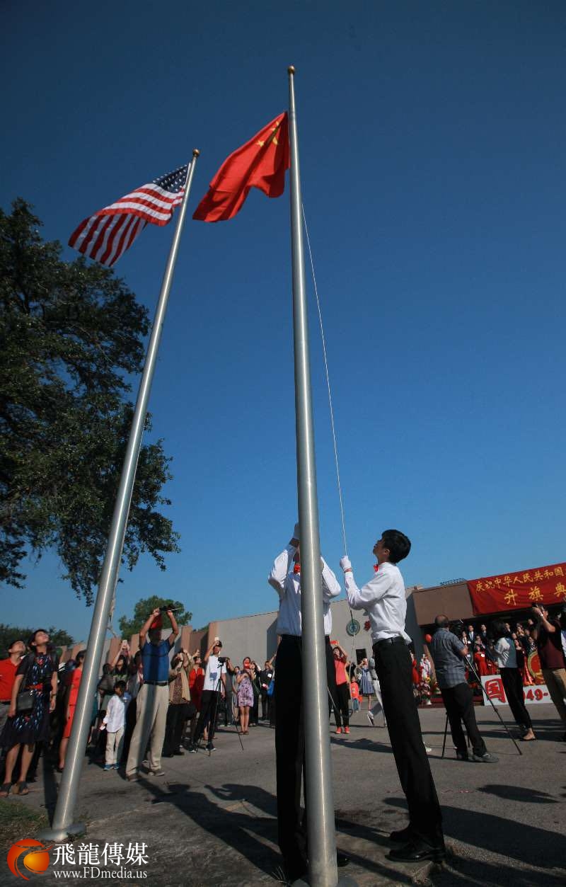 10月1日是中华人民共和国成立68周年国庆日,上午9点30分,休斯敦侨界在中国城的中国人活动中心广场,举行了隆重的中国国庆升旗仪式。在铿锵有力的《义勇军进行曲》中一面五星红旗冉冉升起,那一刻,在场的华侨华人手举五星红旗心潮澎湃欢呼雀跃。中国驻休斯敦总领事李强民和夫人曾红燕女士、刘红梅副总领事以及总领馆全体外交官、以及来自大休斯敦地区华侨华人、留学生、中资机构、各社团负责人和华夏中文学校的同学们约400人参加了当天的活动。