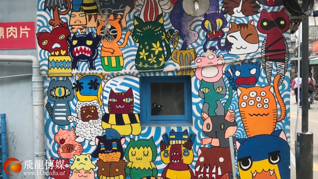 猫街集中了二十几座真猫大小的雕塑,沿街的建筑甚至电线杆上皆绘有五颜六色的猫类涂鸦和壁画。“猫是渔村文化永恒的主题之一。”积极参与社区文化改造的本土艺术家郭明明说。他表示,以前在本地渔民的生活中,猫扮演了很重要的一部分,但随着千篇一律的城市建筑的崛起,这片区域渐渐失去其独特的气质。因此,在绘制壁画的过程中,他为自己笔下的猫画上了古典的旗袍,借以彰显传统文化的魅力。郭明明的猫类壁画原本是独立开展的,后来他加入了由本地大学生组成的社团。他表示,随着猫主题的盛行,其影响力渐渐扩散开来。“整座街坊最终演变成为了一个以猫为主题的社区。”