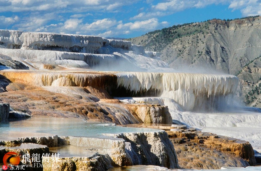 4.猛犸温泉。位于美国黄石公园猛犸温泉,是世界上已探明的最大的碳酸盐沉积温泉。它最显著的特点当属米涅瓦阶地,那是几千年来冷却沉淀的温泉水所形成的一连串阶地,几百万年前马姆莫斯地区底部的海水,为这里留下了厚质的沉淀性石灰石。当高温的酸性溶液流经岩石层到达温泉表面的过程中,它溶解了大量的沉淀性石灰石。一遇到空气,溶液中的部分二氧化碳就会从溶液中挥发。同时固体矿物质形成并最终以石灰华形式沉淀,就形成了阶地。远远望去堆金积玉、晶莹剔透,留下的热泉沿着山坡形成一个一个非常漂亮的五彩大台阶,同样的景色让人不由想到我们中国四川黄龙的五彩池。不一样的是,黄龙是冷泉,猛犸是热泉。