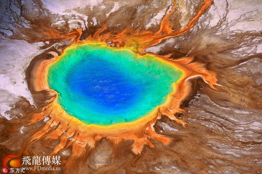 5.五彩斑斓变色温泉。位于黄石国家公园的大棱镜是美国最大的热泉,也是世界第三大热泉,它被命名为“最美的地球表面”。1871年,它被地质学家发现,并因其醒目的色彩而被命名为大棱镜。由绿色到鲜红再到橙色。温泉水中富含矿物质,使得水藻和菌落中带颜色的细菌在水边得以生存,从而呈现了这些色彩。温泉中心地带由于高温没有生物生存。从里向外呈现出蓝、绿、黄、橙、橘色和红色等不同颜色。