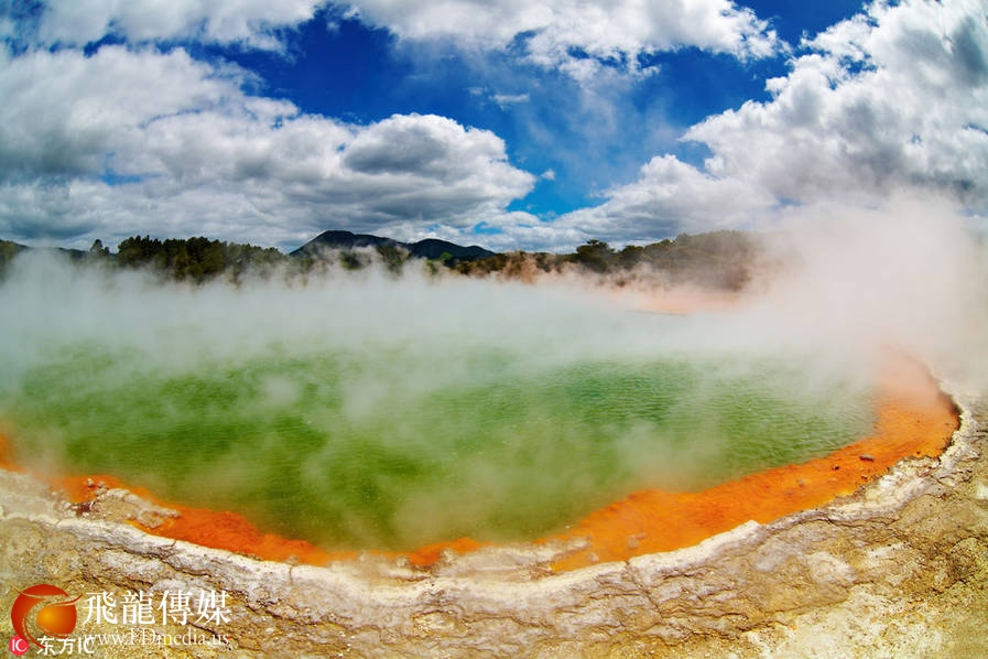 8.新西兰罗托鲁瓦,香槟池。罗托鲁瓦是北岛最负盛名的旅游观光地,有“新西兰温泉城”之称,拥有奇特的地热景观和别具特色的原住居民毛利文化。在罗托鲁瓦城中,在大路边的石缝和居民住宅的小花园里,能看见白色的蒸汽从地下徐徐冒出,空气中弥漫着一股淡淡的硫磺味。