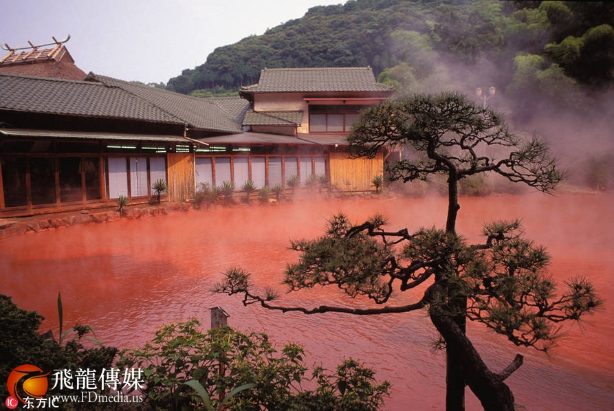 10.血池温泉。血池温泉(Blood Pond Hot Spring)是日本别府知名的“地狱” (日本语为jigoku,指十八层地狱)温泉,其壮观的景象使得慕名前来的人们驻足欣赏,忘记此处乃是洗浴场所,从图上不难发现它的奇特之处,那就是泛着血红色的泉水,好似想象中地狱的景象,而这种红色全得益于水体中富含的铁元素,血池地狱早在8世纪就以“赤汤泉”闻名。它富含酸化铁,好似一池翻滚的血浆,夹杂着巨大的轰鸣声,被日本佛教徒认为是来自幽冥地狱中的激流。利用血池地狱的温泉制成的血池软膏可以治疗脚气,在日本很受欢迎。