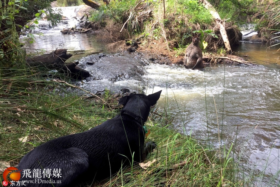 2017年10月12日报道(具体拍摄时间不详),27岁的摄影师Jackson Vincent在澳大利亚北部的玛格丽特河边遛狗,他和爱宠Dharma几乎同时发现了一头动物中的“全能王”——身高近1.95米,体重达101公斤的袋鼠。供图:东方IC