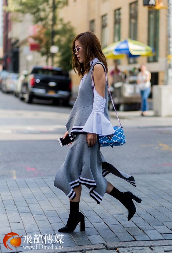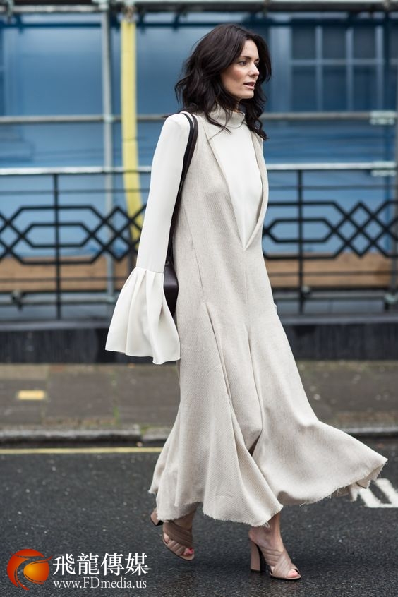 亦或来一条喇叭袖的长裙,在秋冬季节也完全可以驾驭,选择厚重一点的材质,更有质感,外面搭配一件大衣或者长马甲都是不错之选。