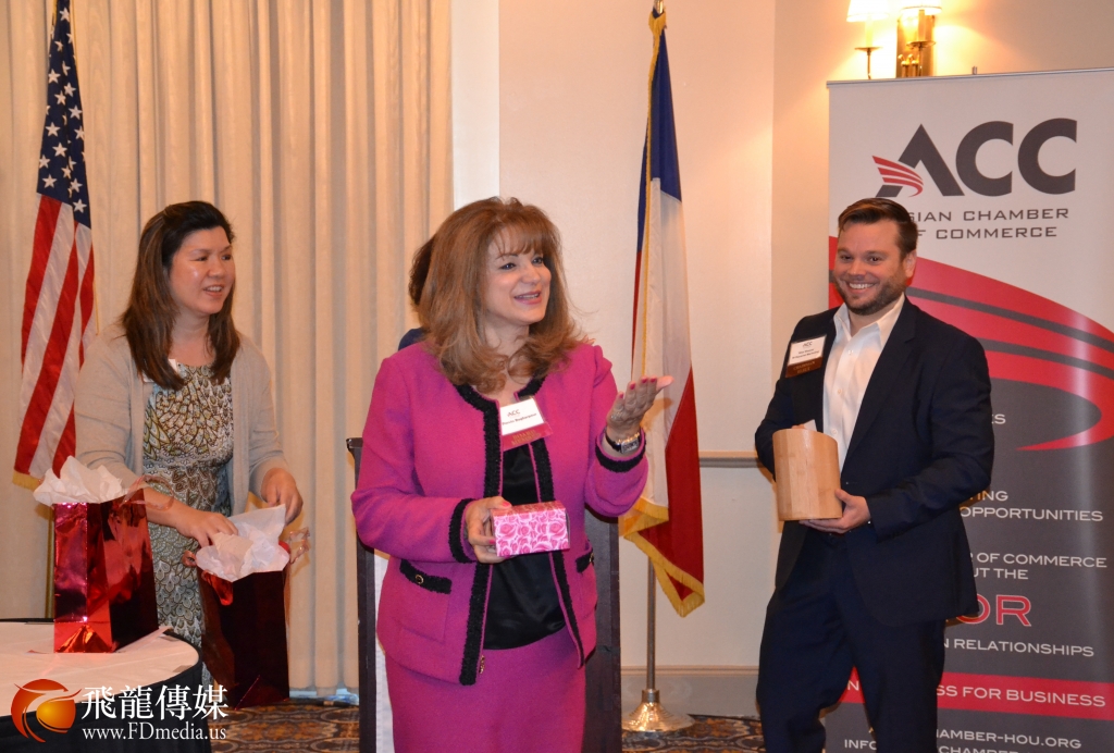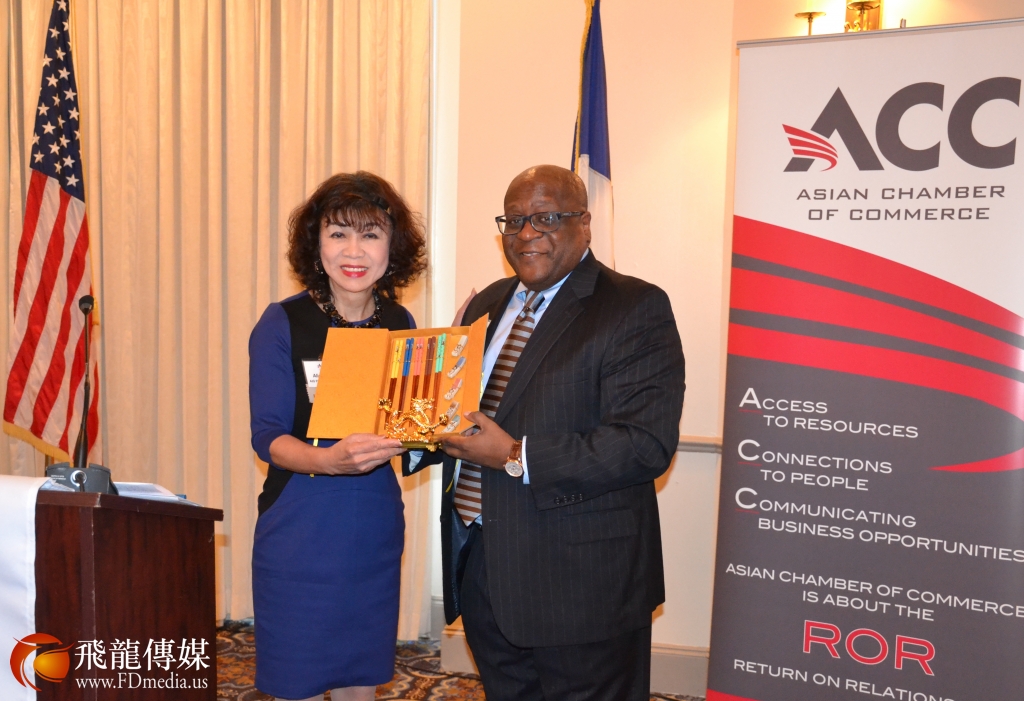 亚商会亚商会董事会理事谭秋晴代表亚商会赠送一个中国特色的礼物“筷子”给美国联合航空公司首席执行官Gregoey Jones。