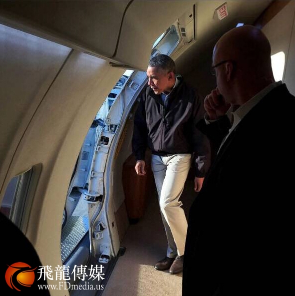 奥巴马准备走下空军一号。