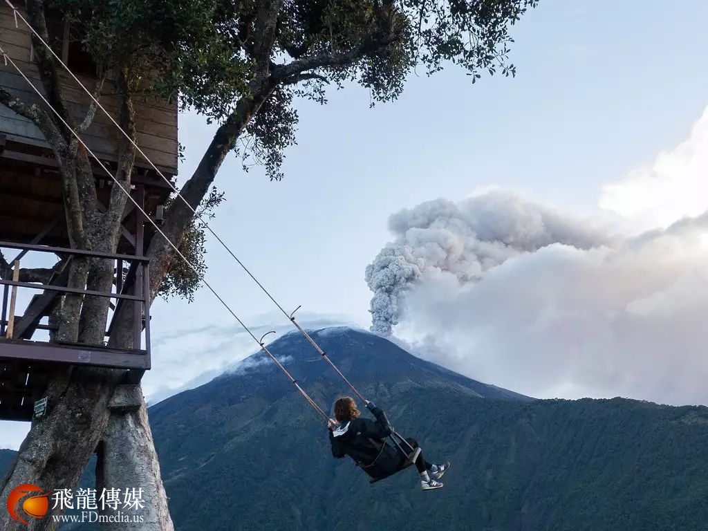 荡在这个位于海拔2600 米、悬挂在大约十层楼高垂直斜坡的秋千上,还能顺带欣赏远处活火山滚滚浓烟的惊叹美景。