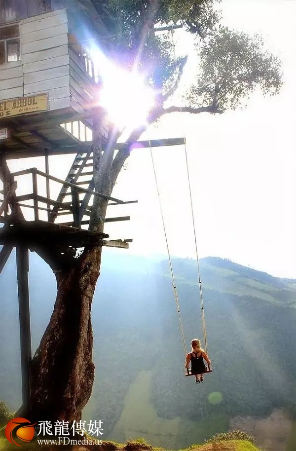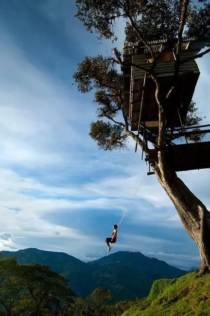 这是南美洲厄瓜多尔城镇Baños 里,悬崖边上的一座树屋。