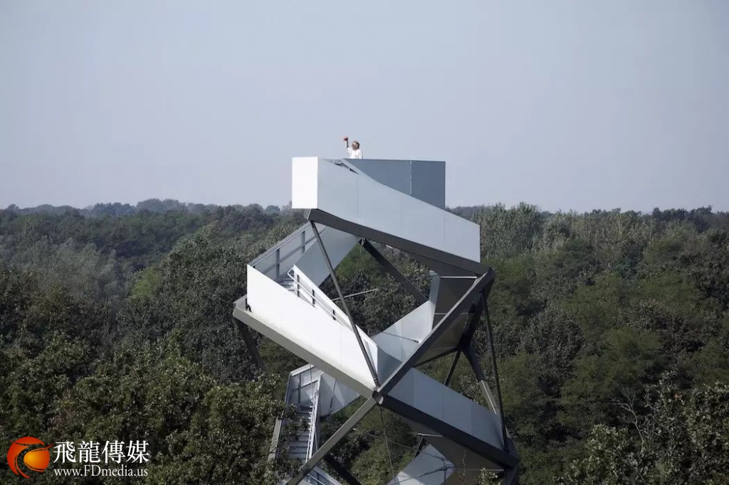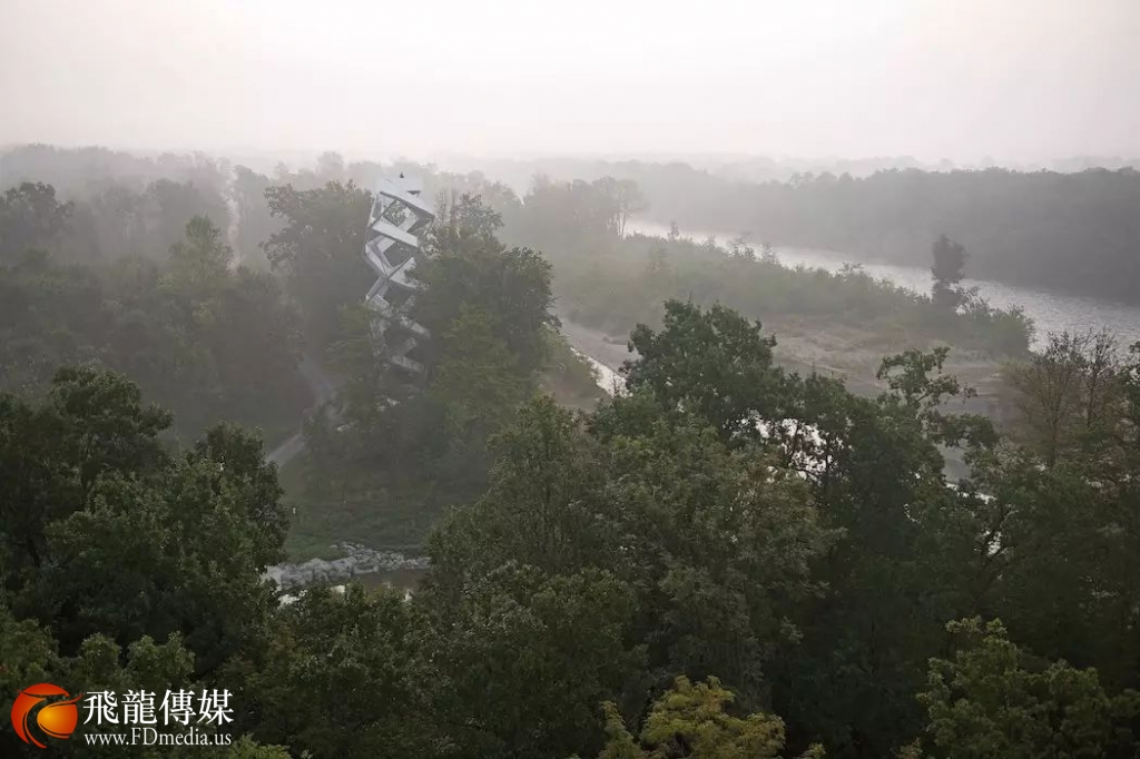 游客环绕着步行而上,体验不同层次的树林生态景观,经过168 步来到相当于九层楼高的观景平台。