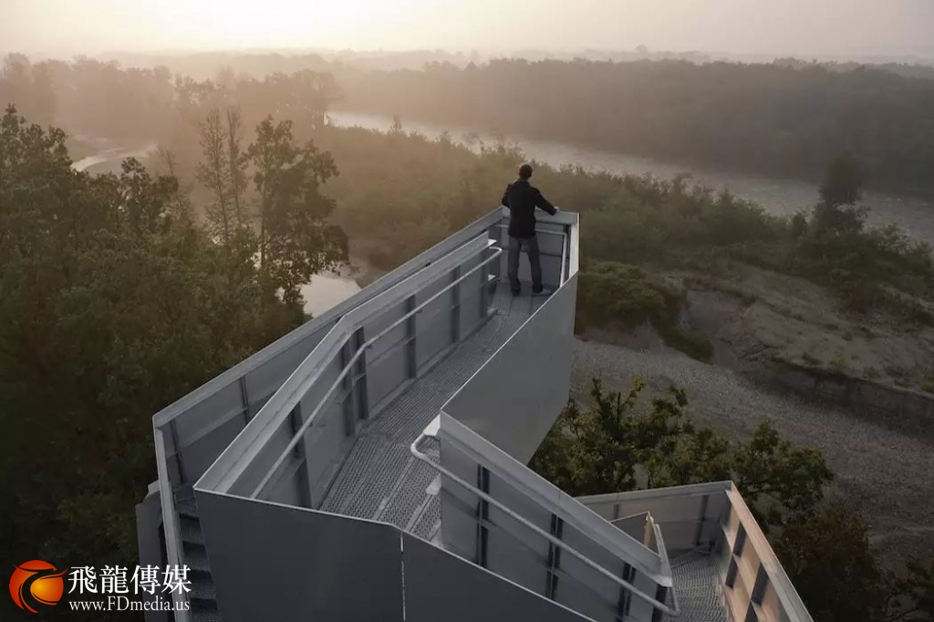 这座瞭望塔矗立在森林中,拥有朝向穆尔河岸的广阔视野。