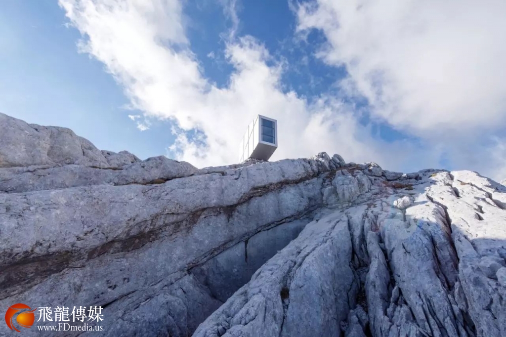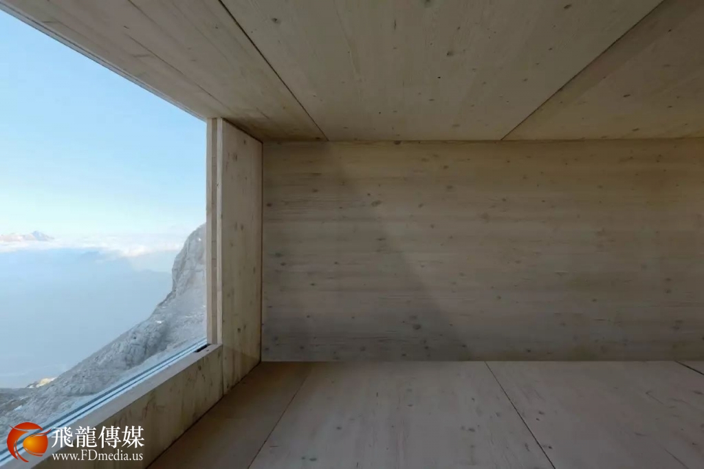这是一间只有不到10 平方米的小木屋,由直升机艰辛地运输材料才得以搭建在这个偏远的悬崖边上。斜斜向外伸出,以便把雪山与蓝天的全部美景尽收眼底。