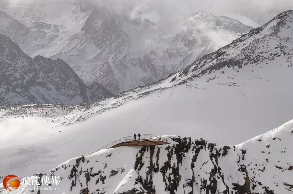 滑雪,然后乘坐缓慢的雪地车,再步行、攀爬,最终抵达这里——一个小小的瞭望平台。
