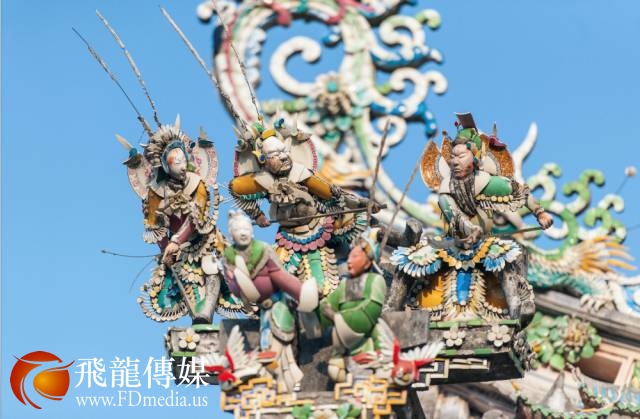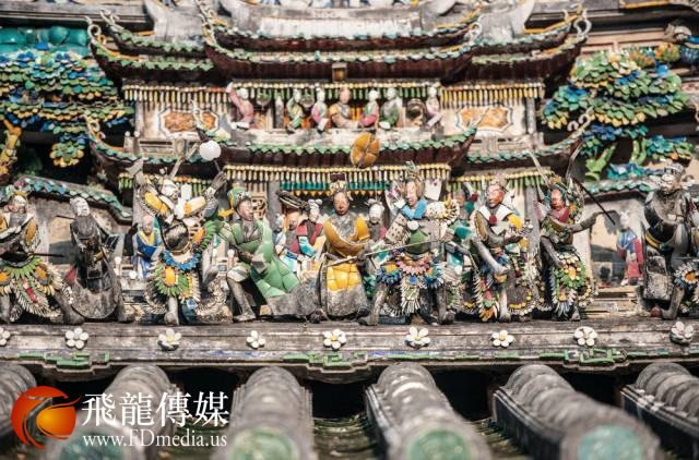 若你留心关帝庙的屋顶,色彩鲜艳、密密麻麻的一片,细看之下,竟然都是人物造型。尤其是关帝庙的太子亭,上有英雄人物120个,全部是诸如岳母刺字,穆桂英挂帅这样脍炙人口的故事……而这些人物造型,均来源于剪瓷雕这项传统工艺。