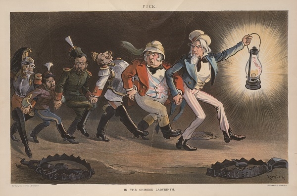 庚子之变,美国以西方领袖自居,其心态与欧洲列强也不完全相同。《顽童杂志》形容中国的形势像迷宫一样错综复杂,稍有不慎就会战端再起,后果无法预期。图中美国山姆大叔举着谨慎的汽灯小心前进,随后而行的英德俄日奥神态各异,但谁也不敢去碰地上“开战理由”的圈套。