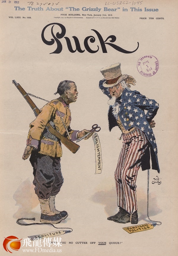 1911年辛亥革命胜利,清政府被推翻,民国成立,中华民族迈入新的历史纪元。《顽童杂志》1912年1月31日的封面漫画上,中国士兵已经用文明进步的剪刀剪掉了象征奴役落后的辫子,并反问山姆大叔:你什么时候也剪掉你的辫子?辛辣地讽刺了美国政治深陷两党恶斗的漩涡。