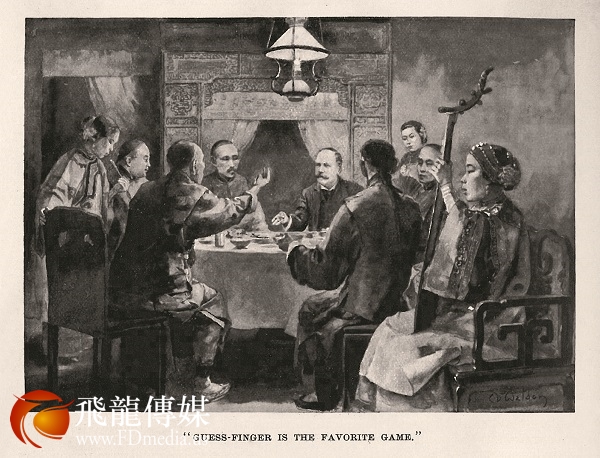 划拳又叫猜枚、猜拳、拇战,起源于汉代,是中国饭局交际中一种即兴娱乐的游戏。划拳不仅斗智斗勇,增添酒兴,烘托喜庆,且因玩时须喊叫比划,极易让人兴奋。《哈泼斯月报》插图描绘了酒席上中外人士酒酣耳热,吆五喝六,气氛十分热烈,一旁还有数名女子斟酒奏琴相陪。