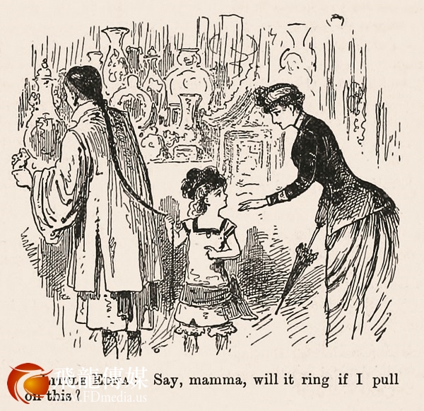 这幅漫画描绘了一家华人古玩店内的场景,意在嘲笑在美华人的发辫与西方社会规范格格不入。女童埃德娜扯着店主的辫梢,天真地问道:妈妈,铃铛会响吗?