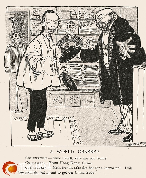 《顽童杂志》1902 年4月6日漫画对在美的犹太人和华人有着明显的种族歧视倾向。图中一名来自德国的犹太帽商正在咄咄逼人地向来自香港的华工推销他的圆帽:买一顶吧,我的朋友,只要25 美分,赔本我也要做成这笔对华贸易!