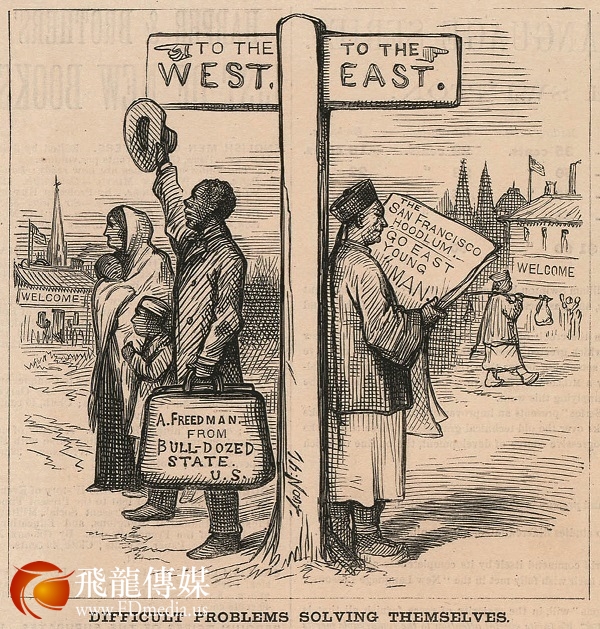 19 世纪末美国东西两岸针对黑人和华人的种族歧视和迫害,导致了许多人选择逃离伤心之地,一路迁徙去寻找新的幸福之乡,纳斯特以此为题在1879年3月29日的《哈泼斯周报》上发表漫画。图中一名华人在阅读旧金山暴徒发布的告示,而与其他白人移民一起的年轻黑人则手持自由人的包裹向着西部挥帽憧憬。