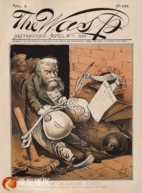 国会通过《排华法案》后,美国第二十一任总统切斯特·阿瑟(Chester A. Arthur,1829–1886)面临两难选择,一方面是与中国修订的条约,另一方面是来自国内的强大政治压力。有鉴于1879年的国会《排华法案》曾经被当时的海斯总统否决的前例,《马蜂杂志》认定总统阿瑟已经被特殊利益集团收买。在其4月14日的封面漫画中,阿瑟被丑化成一条腿已经穿上了华人裤子的政客,身后还有华人在帮他梳理发辫,阿瑟脚上分别束缚着“无知”和《圣经》的镣铐,双手则被“华人资金”和“轮船与铁路运输利益”紧紧捆绑,面对美国参议院通过的《排华法案》无能为力。图下并附有注解:管理自由民者当首先解放自己。