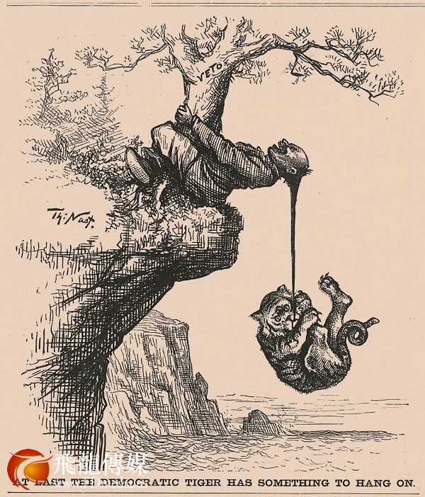 千钧一发( At Last the Democratic Tiger Has Something to Hang On),《哈泼斯周报》1882年4月22日,256页。