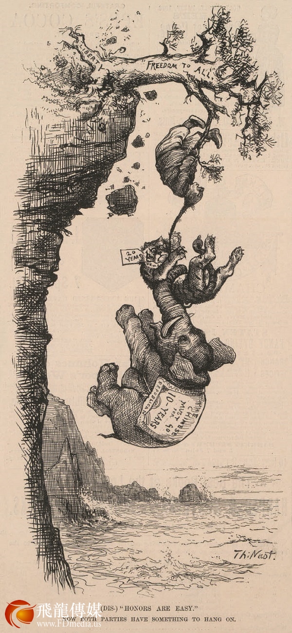 《哈泼斯周报》1882年4月22日刊登纳斯特作品,辛辣地讽刺了民主党在通过《排华法案》过程中所起的恶劣作用。民主党在南方蓄奴问题和美国内战中站到了错误的一边,实力大挫,白宫长期由共和党人把持,后来发现通过掀起种族恐惧与歧视对其迅速恢复政治影响力大有帮助,因此在排华问题上不遗余力。图中华人紧紧抱着总统“否决”的小树才不至于堕入深渊,而华人的发辫却成了民主党人赖以生存的救命稻草,在作者眼里这是何等的讽刺,纳斯特毅然把自己的名字签到了华人的一侧。