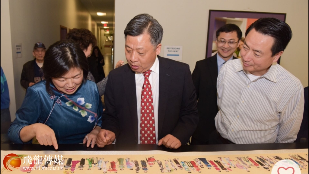 北美中国旗袍会创会会长张若葵(Renee Zhang)给李强民总领事展示百位旗袍佳丽长卷