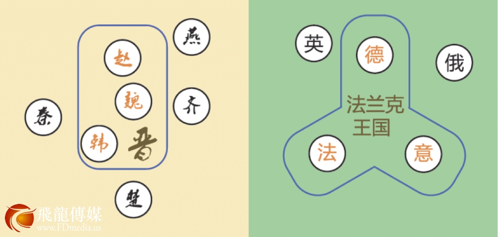 法、德、意三国比较类似于战国时期的赵、魏、韩三国。后者是春秋晚期三家分晋的产物,前者则是法兰克王国一分为三的产物。