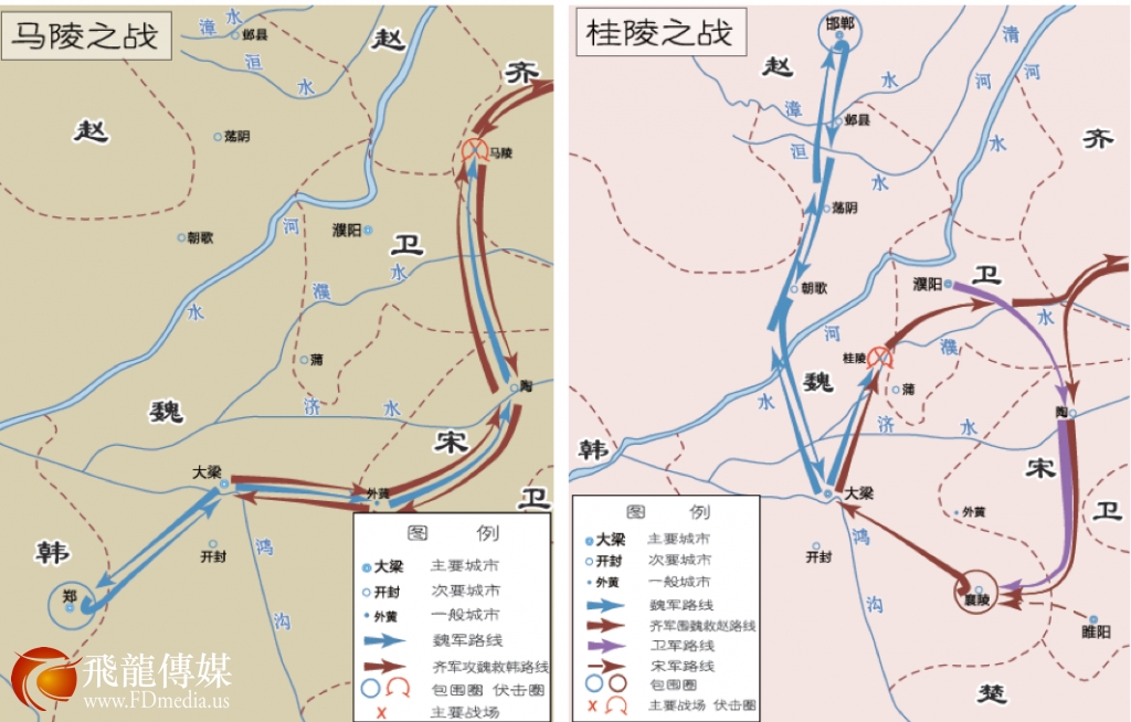 马陵之战(围魏救韩)和桂陵之战(围魏救赵)示意图
