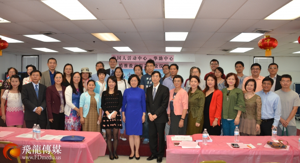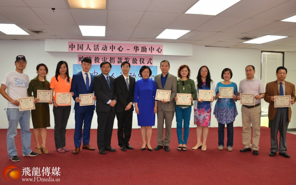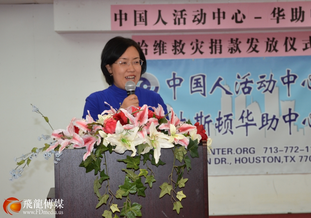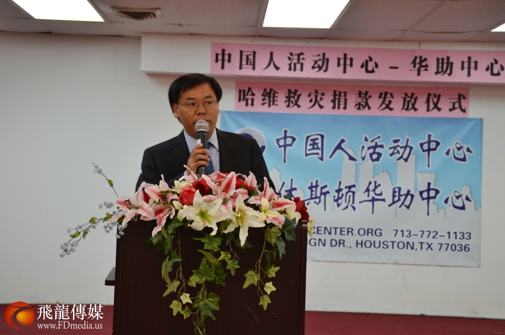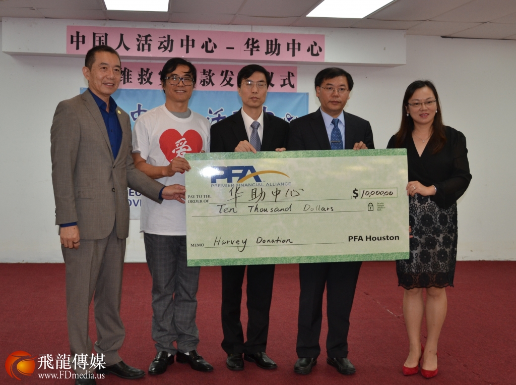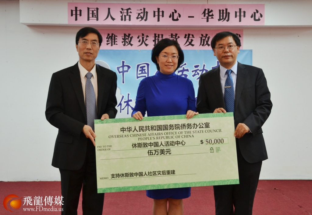 国侨办哈维救灾资金捐赠5万美金仪式,由刘红梅副总领事代表国侨办捐赠, 靳敏、范玉新代表中国人活动中心-华助中心接受捐赠,国侨办捐赠的5万美金,其中2万美金平分到187户家庭每户106.96。