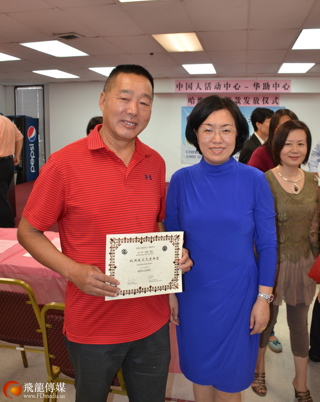 资助HPD牺牲警察家庭Perez Family $5000,为救灾牺牲的警察 HPD Union President RAY HUNT代表其领奖,由刘红梅副总领事、董事长靳敏、执行长范玉新给警察捐赠。