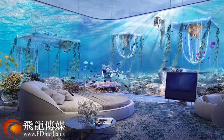 在酒店周围将种植超过四千多平方英尺的珊瑚来吸引大量海洋生物, 隔着透明的亚克力玻璃欣赏阿拉伯海底的海景,完美的阿拉伯海沉浸式深度水下体验。