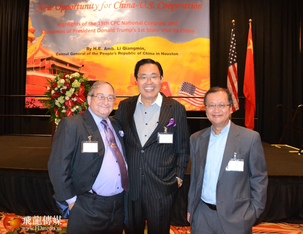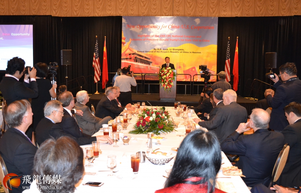 李总领事以“新时代·新发展·新机遇”为题,介绍中国共产党十九次代表大会胜利召开的情况以及特朗普总统月初成功访华的丰硕成果,并从基础设施建设和融资、能源、农业等方面深入分析了中美友好将给美南地区带来的新机遇。李总领事演讲后还就宾客关心的中国发展成就、金融、贸易政策、中美关系等回答了提问。