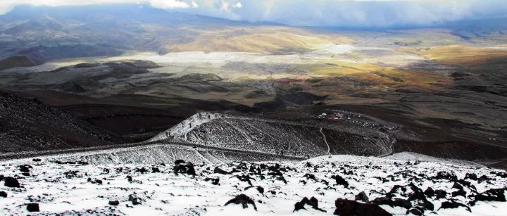登山起点是火山北坡上的一座小屋,午夜刚过就要出发,以便赶在清晨云雾尚未出现前登顶,在积雪松动之前下山。登顶需要5~7小时,下山需要3小时。在山顶能看到厄瓜多尔的最高峰钦博拉索山(Chimborazo;海拔6310米)。