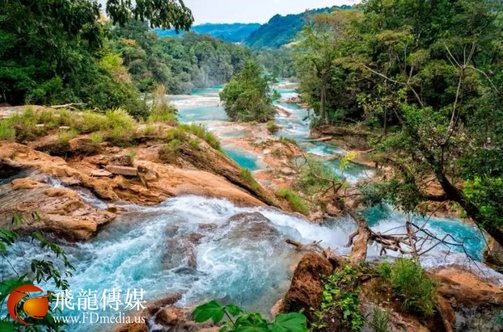 位于热带丛林中的蓝水瀑布(Agua Azul),由于水质富含矿物,因此呈粉蓝色,尤其是在山脚下的瀑布水潭在阳光的照射下,清澈晶莹,蓝得非常漂亮。沿着河水逆流而上,这条河“台阶”较多,落差不大。山上的水流没有那么湍急,很多地方都是缓缓而流的。到达山顶可以看到几个平缓碧绿的池水。