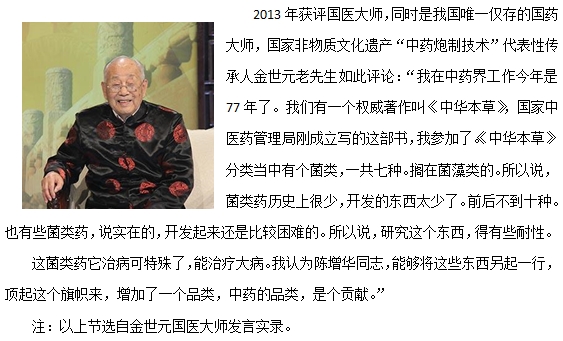 中国中药协会会长、中国国家中医药管理局原常务副局长房书亭如此评价菌物医学:“实际上这个中医药用菌物那是有历史的,有年头的。陈增华他们这个企业搞这个标准,本身也是一个大好大好的事,抓住几个重点的菌物药研究,那就很可能在科学界有一个突破,甚至有可能第二个诺贝尔奖就在这里面出现。”